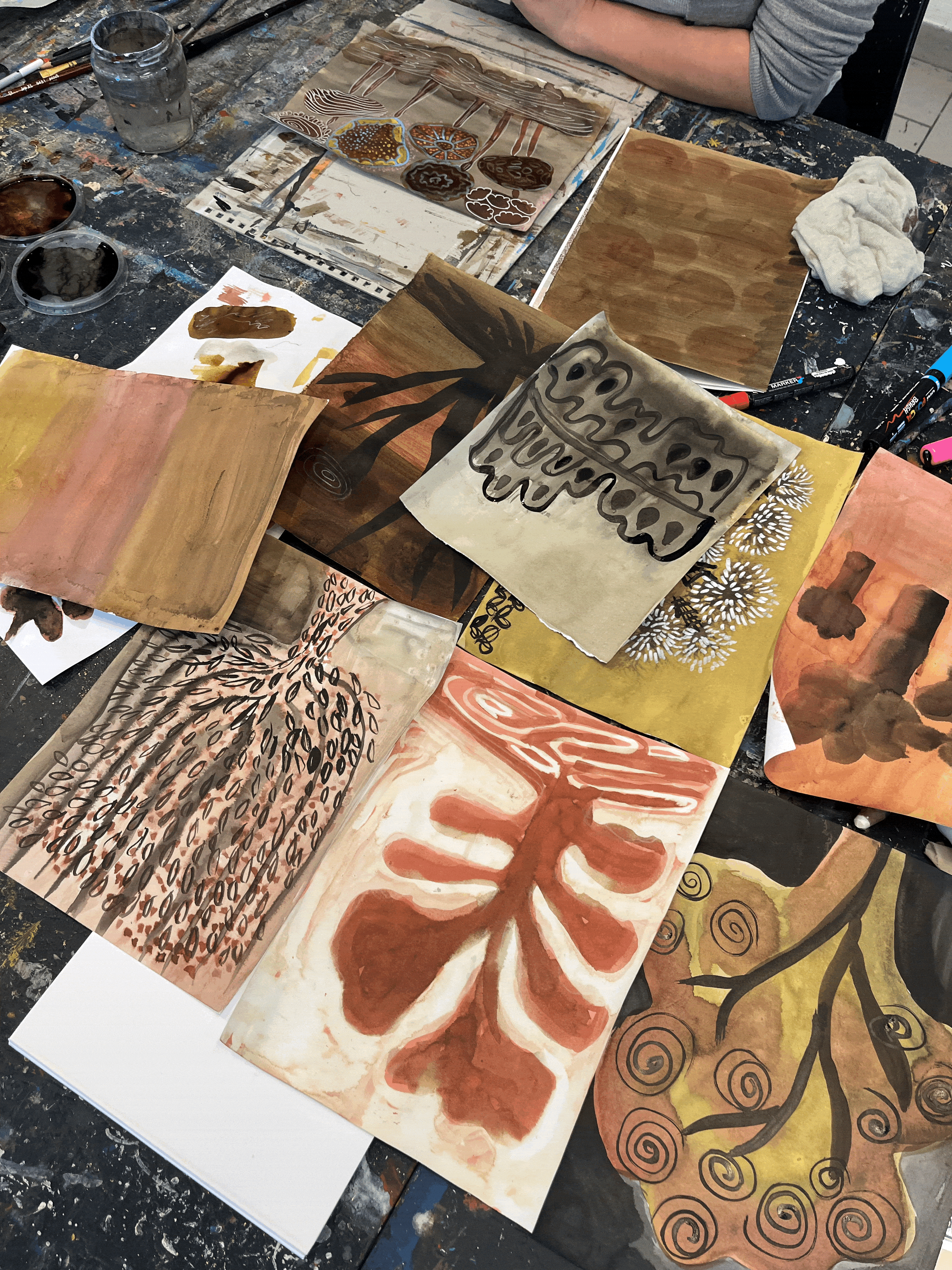 L’atelier stimule la créativité à travers monotype, pochoirs, altérations et surpeinture, en explorant pinceaux, spatules et outils improvisés comme corde, fil ou papier abrasif.